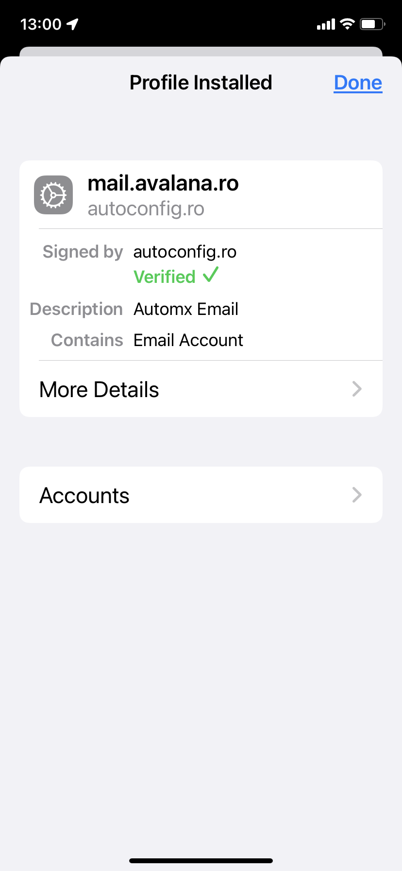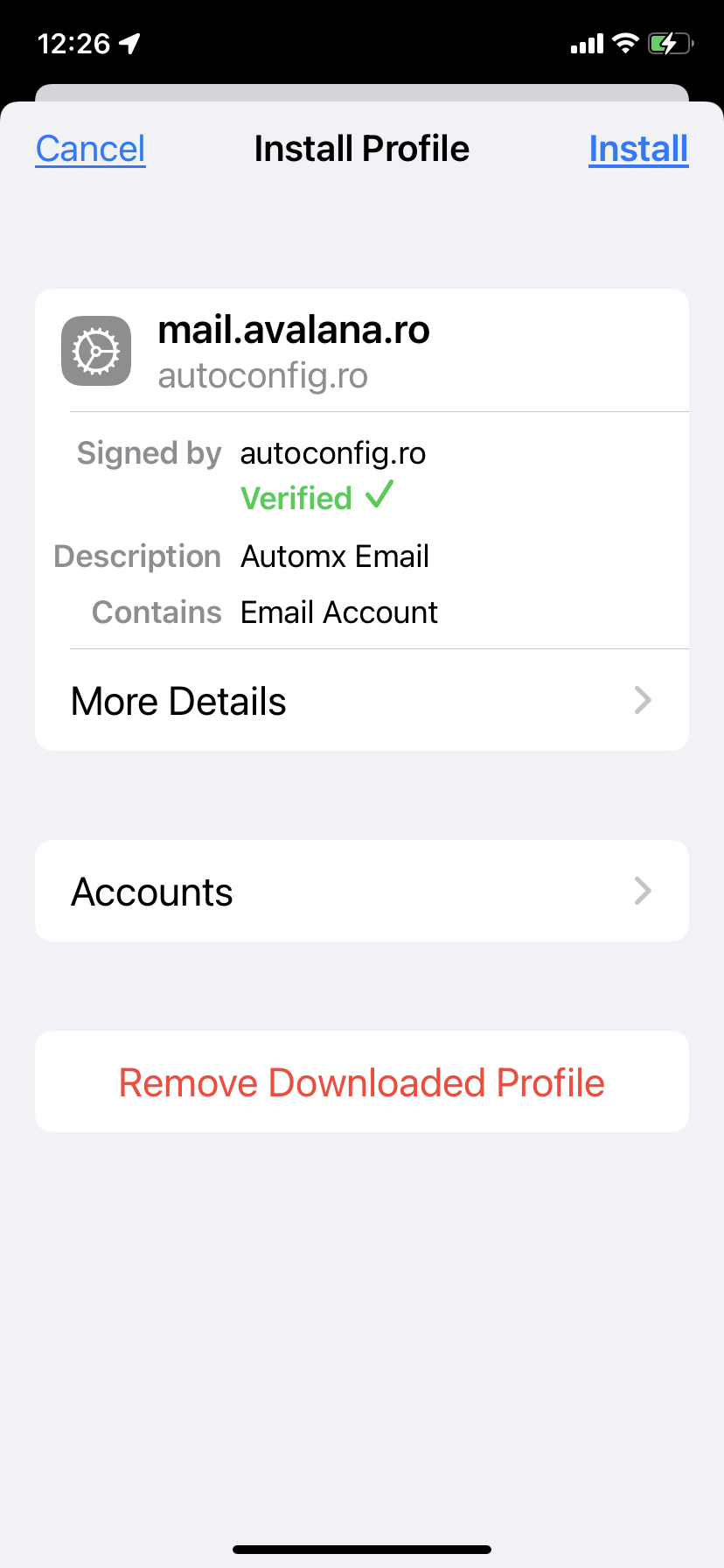 5. Verificați că profilul provine de la serverul corect (mail.avalana.ro) și că este semnat cu un certificat digital (verificat) de la autoconfig.ro și abia apoi apăsați butonul "Install". În cazul în care profilul provine de la un alt server decât "mail.avalana.ro" sau este semnat cu un alt certificat decât "autoconfig.ro" sau certificatul nu este verificat (apare cu roșu în loc de verde) opriți imediat procedura de instalare și cereți suport de la administratorul de rețea.