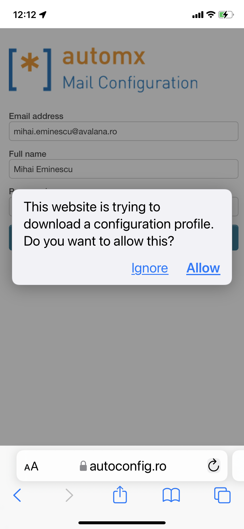 1. Accesați site-ul https://autoconfig.ro folosind browserul Safari (nu va funcționa cu alt browser). Completați cu datele contului (adresa de mail, numele complet si parola contului de mail) apoi apăsați butonul "Request configuration!"